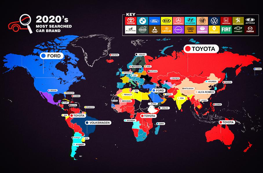 Locul trei este ocupat de Mercedes-Benz, care este cel mai adesea căutat în 15 țări, urmat de Kia, Ford, Volvo, Audi, Honda, Nissan, Renault, Hyundai și Peugeot.