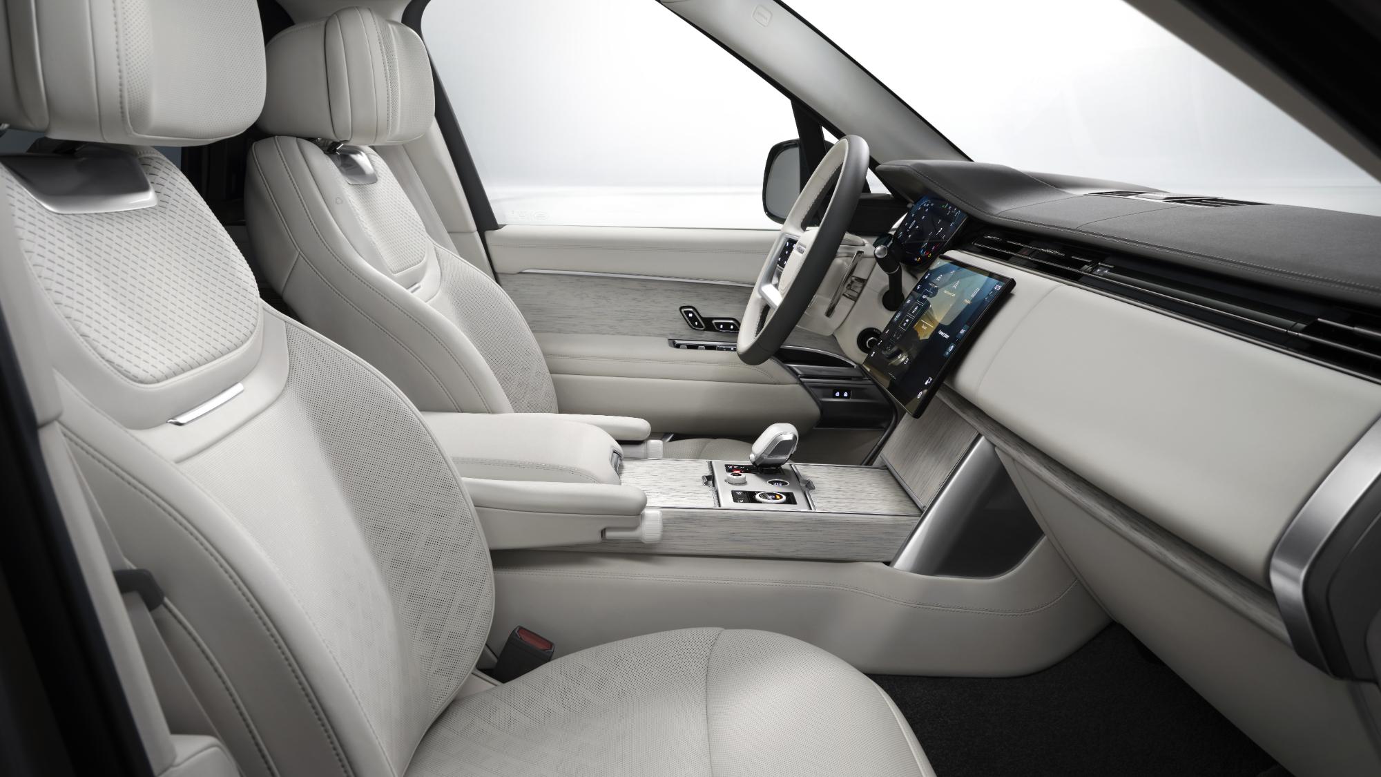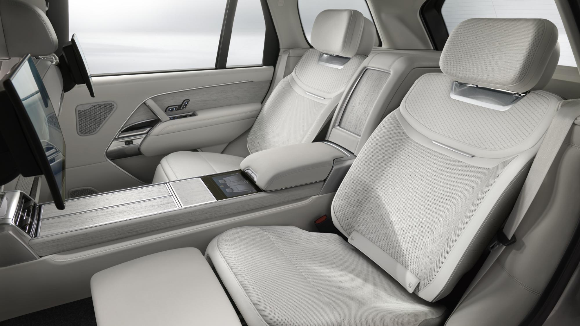 Habitaclul duce conceptul de rafinament la extrem. Interiorul este îmbrăcat în materiale ecologice Ultrafabrics, în combinații de alb Orchid și gri Cinder. Scaunele au detalii realizate cu laser, o premieră pentru Range Rover, iar selectorul transmisiei este realizat din ceramică. Elementele decorative includ inserții din lemn de palmier ratan, amplasate pe cotiere și pe ușa frigiderului integrat.