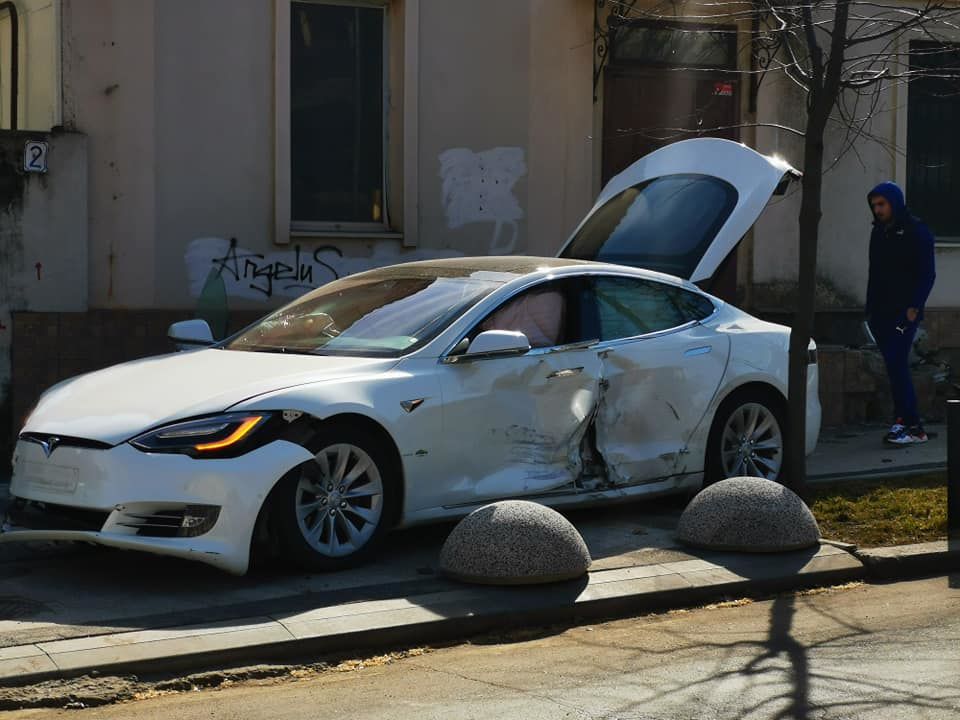 Impactul s-a produs la orele amiezii, Mercedesul tâmponând lateral Tesla în circumstanțe neclare.