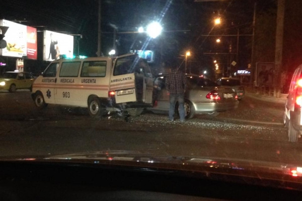 Ieri seara în centrul capitalei s-a produs un accident rutier cu implicarea unei ambulanțe și a unui Mercedes.