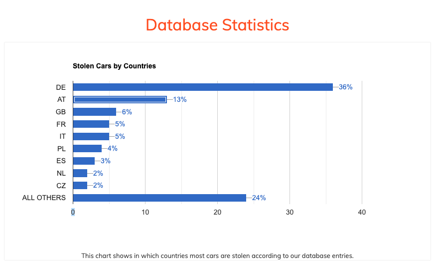 Și dacă vorbim despre țări, atunci Germania este țara numărul 1 de unde se fură cele mai multe mașini! Tocmai 36%, urmată de Austria pe locul 2 cu 13% și Marea Britanie pe locul trei cu 6%.