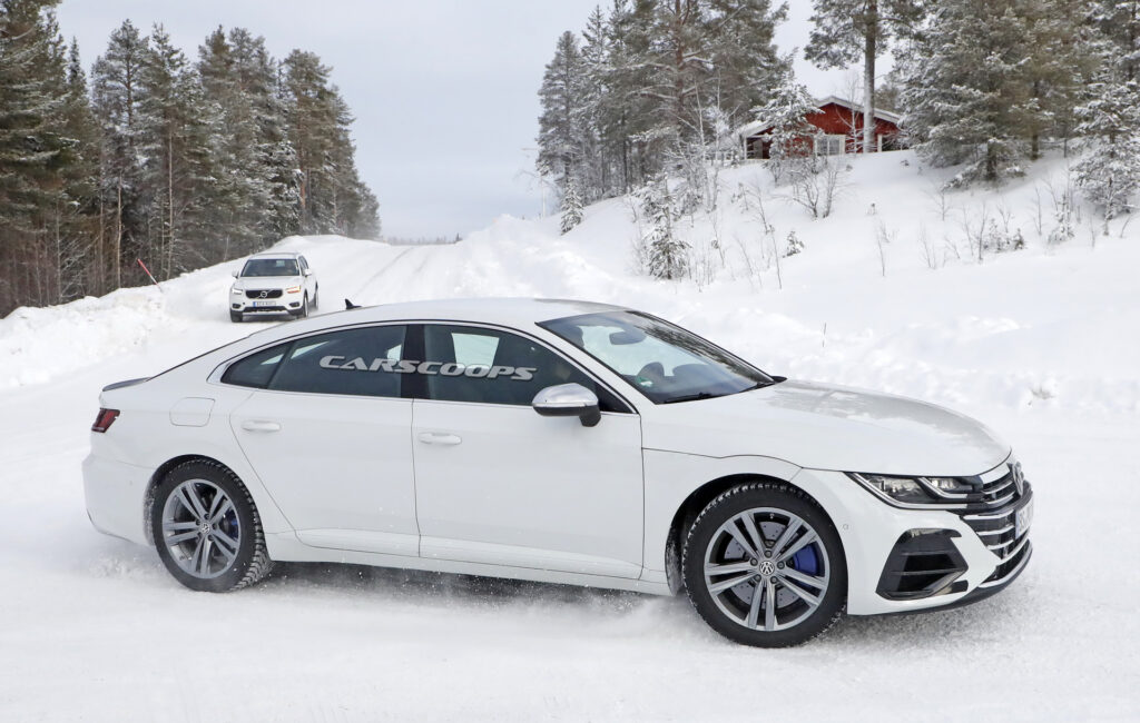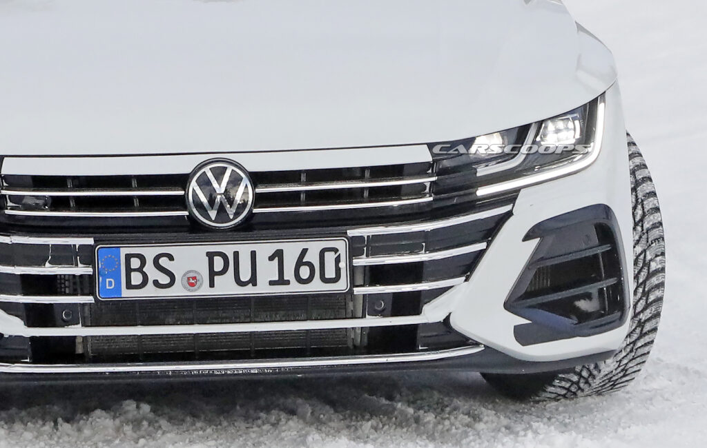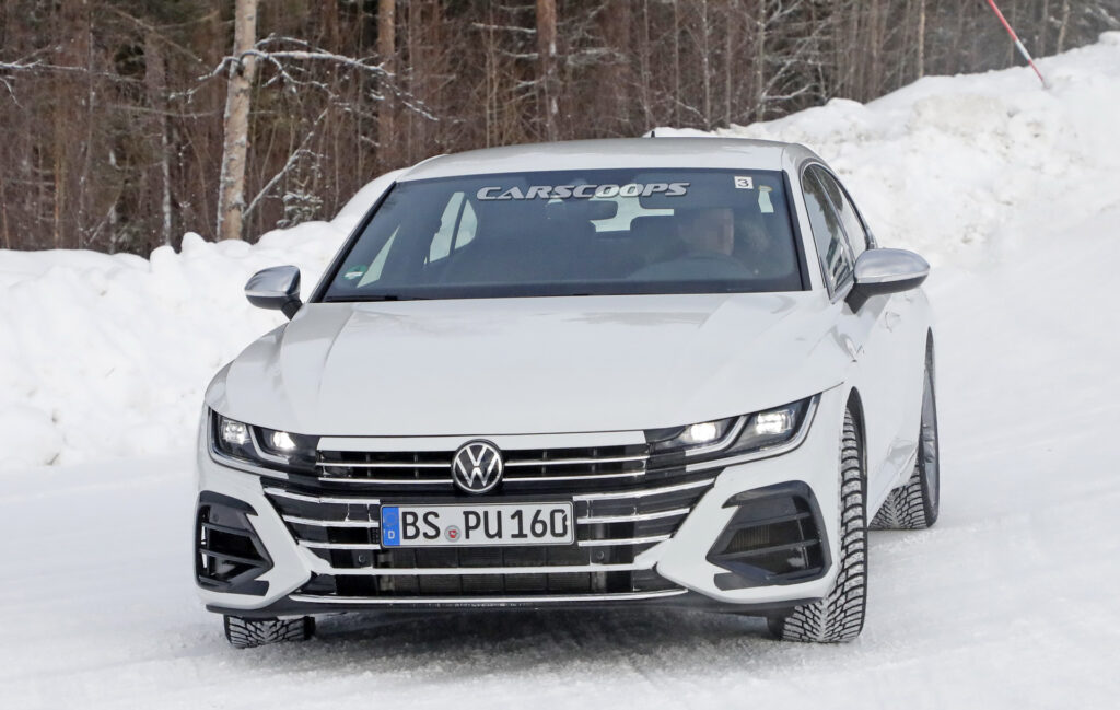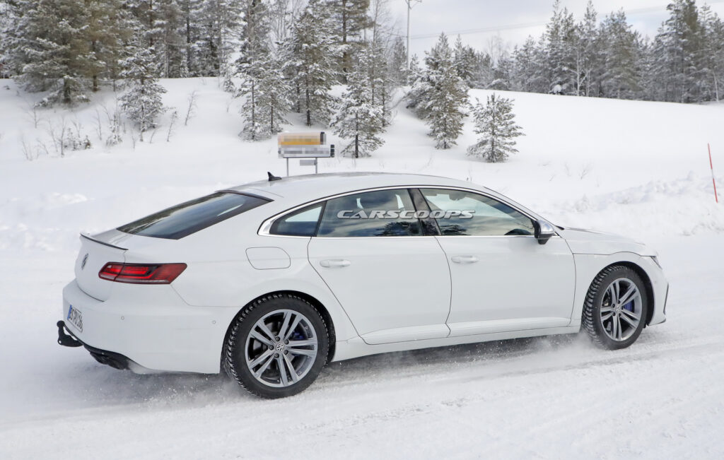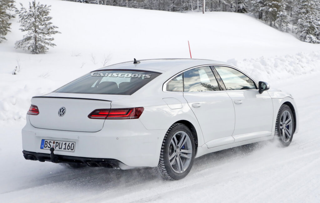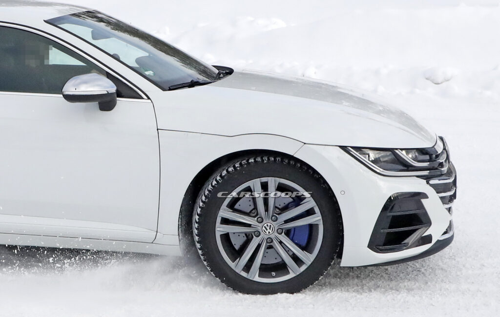 Volkswagen Arteon R, ar putea fi chiar modelul surprins de fotografi. Acesta se remarcă printr-un facelift ușor și câteva soluții de design, dictate de o creștere a puterii motorului. Despre acest lucru vorbește întâi de toate bara față cu guri de aerisire mai proeminente, bara spate cu un nou difuzor ce găzduiește patru finale ale sistemului de eșapament, dar și discurile de frână ”găurite” împreună cu etrierii albaștri.