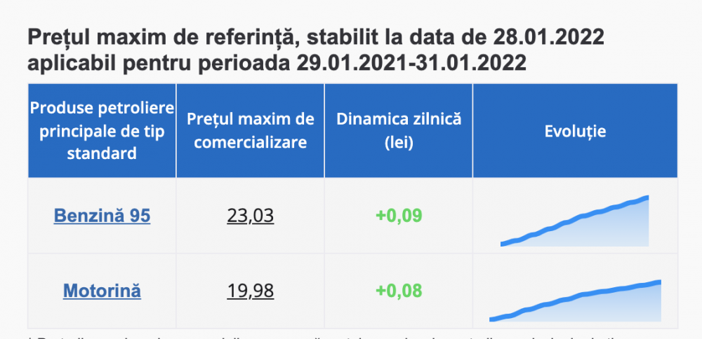Astfel, atestăm o creștere cu 9 bani a prețului pentru benzină și într-un final acesta constituie 23.03 lei. În acest timp, prețul pentru un litru de motorină crește cu 8 bani și constituie 19.98 lei.