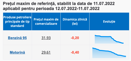 Astfel, pentru mâine 12 iulie, este anunțată o ieftinire a benzinei cu 20 de bani care ajunge să coste maxim 31.91 lei, în timp ce motorina se ieftinește cu tocmai 40 de bani și se va comercializa nu mai scum de 29.61 lei.