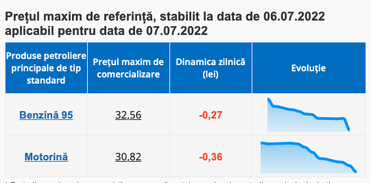 În aceste condiții, pentru ziua de 7 iulie, ANRE anunță o ieftinire a benzinei cu 27 de bani, care ajunge să coste cel mult 32.56 lei și a motorinei cu 36 de bani, care se va comercializa nu mai scump de 30.82 lei.