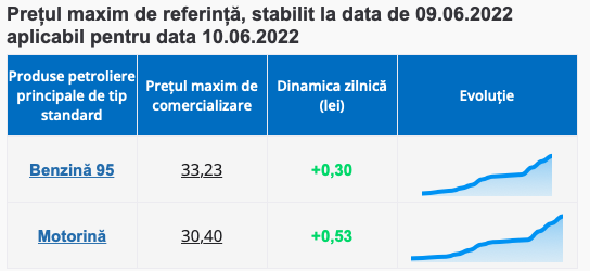 Pentru mâine, 10 iunie, Agenția anunță o scumpire a prețului benzinei cu 30 de bani, care atinge un nou preț record de 33.23 lei, în timp ce motorin adaugă la cost 53 de bani și ajunge să se comercializeze cu un preț nemaipomenit de 30.40 lei!