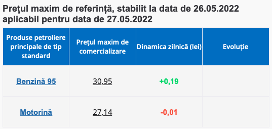Așadar, pentru mâine 27 mai, Agenția anunță scumpirea benzinei cu 19 bani, astfel că prețul la pompă va fi de cel mult 30.95 lei. În același timp, motorina se va ieftini cu 1 ban și se va comercializa cu maxim 27.14 lei!