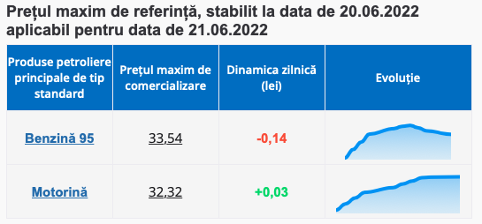Agenția anunță pentru mâine 21 iunie, un preț al benzinei mai mic cu 14 bani, care se va comercializa cu maxim 33.54 lei. În același timp, motorina continuă să se scumpească, iar mâine va cista cu 3 bani mai mult, adică maxim 32.32 lei.