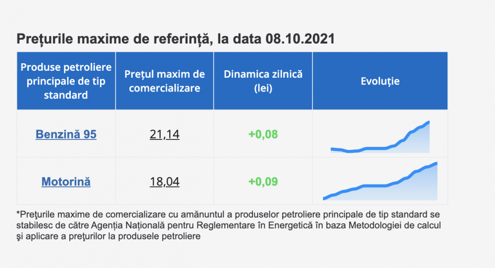 În această ordine de idei, prețul motorinei pentru un litru, depășește 18 lei! Acum prețul este cu nouă bani mai mare și constituie 18.4 lei. Între timp, benzina standard se scumpește cu opt bani și prețul pentru un litru ajunge la 21.14 lei.