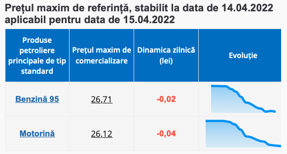 Potrivit Agenției, benzina se ieftinește cu doar 2 bani și se va comercializa maxim cu 26.71 lei, în timp ce motorina la fel scade aproape insesizabil din preț, 4 bani, la benzinării costul maxim fiind de nu mai mult de 26.12 lei!