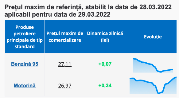 Astfel, pentru ziua de mâine, 29 martie, ANRE anunță o scumpire a prețului benzinei cu 7 bani, care ajunge să coste la pompă maxim 27.11 lei. În același timp, motorina adaugă la cost tocmai 34 de bani și se va comercializa cu maxim 29.97 lei.