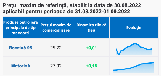 Așadar, mâine, 31 august, benzina se va scumpi cu 1 ban și se va vinde cu cel mult 25.72 lei per litru, în timp ce motorina adaugă la cost încă 18 bani și se va comercializa la benzinării cu maxim 27.92 lei per litru.
