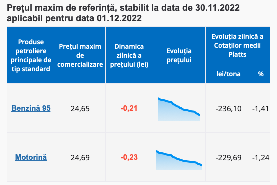 Astfel, benzina scade din cost 21 de bani și se va comercializa cu cel mult 24.65 lei per litru, în timp ce motorina se ieftinește cu 23 de bani și va avea un preț maxim de 24.59 lei per litru.