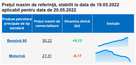 În același timp motorina se ieftinește cu 17 bani și se va comercializa cu maxim 27.31 lei.