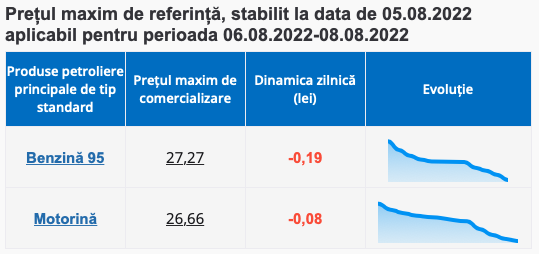 Pentru mâine, Agenția anunță o ieftinire a benzinei cu 19 bani, care va ajunge să fie comercializată cel mult cu 27.27 lei per litru. În același timp, motorina scade din cost 8 bani și va avea un preț nu mai mare de 26.66 lei per litru.
