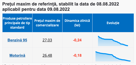 Pentru mâine, 9 august, Agenția a nunță o ieftinire de 24 de bani pentru benzină, care ajunge să coste 27.03 lei, în timp ce motorina scade din preț 18 bani și se va comercializa cu un preț nu mai mare de 26.48 lei per litru!