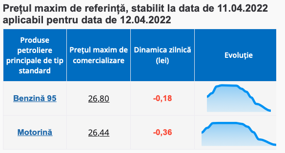 Astfel, pentru mâine, 12 aprilie, Agenția indică o ieftinire a benzinei cu 18 bani care ajunge să coste 26.80 lei, în timp ce motorina scade din preț 36 de bani și se va comercializa la stațiile PECO cu maxim 26.44 lei.