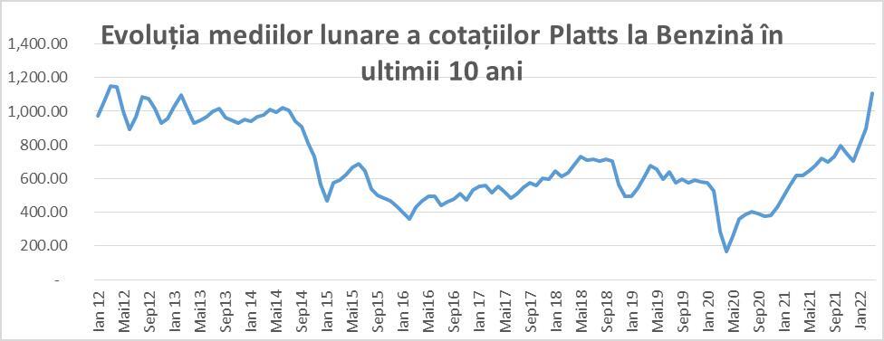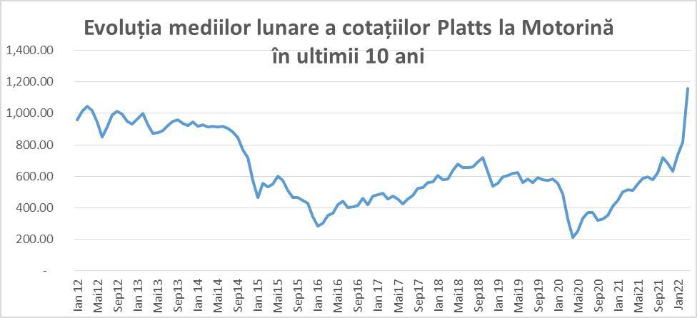 Cotațiile Platts, la rândul lor, au depășit nivelul de 1100 și 1150 de $/tona pentru benzină și, respectiv, motorină și sunt acum la cel mai înalt nivel din ultimii 10 ani. Evoluția cotațiilor în perioada anilor 2012 – 2022 poate fi analizată în graficele de mai jos: