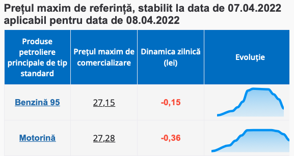 Pentru ziua de mâine, Agenția anunță o ieftinire a benzinei cu 15 bani care va ajunge să coste la pompă 27.15 lei, în timp ce costul motorinei scade cu tocmai 36 de bani și se va comercializa la cu maxim 27.28!