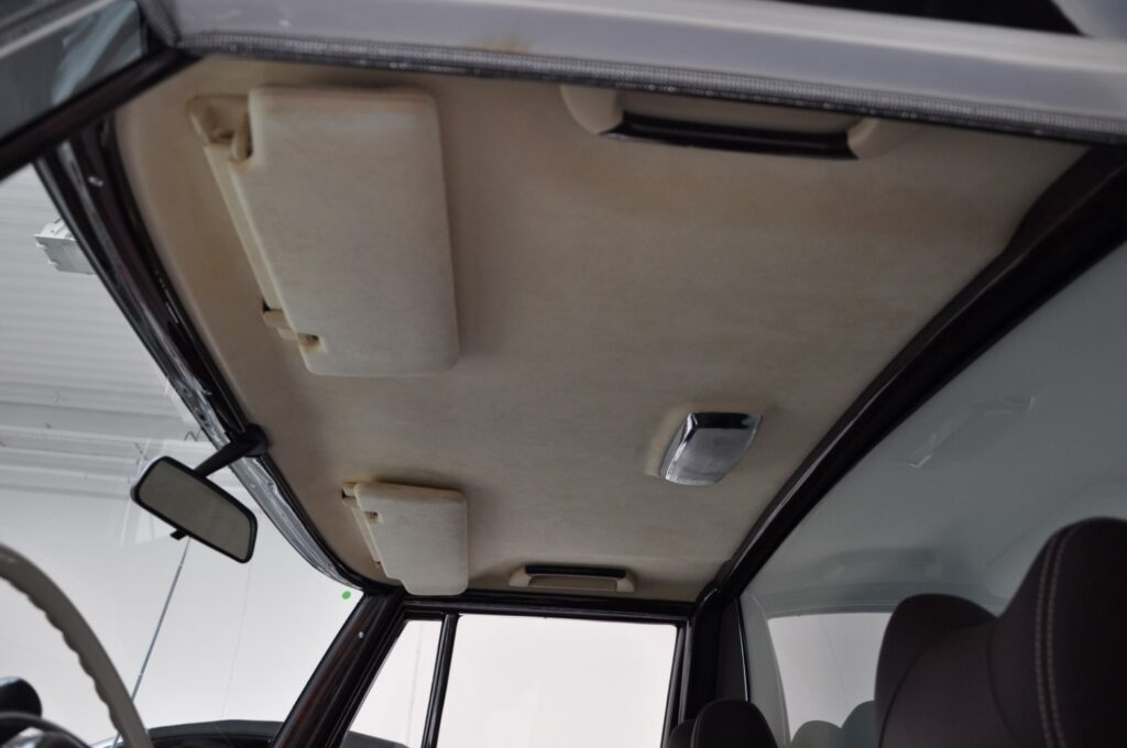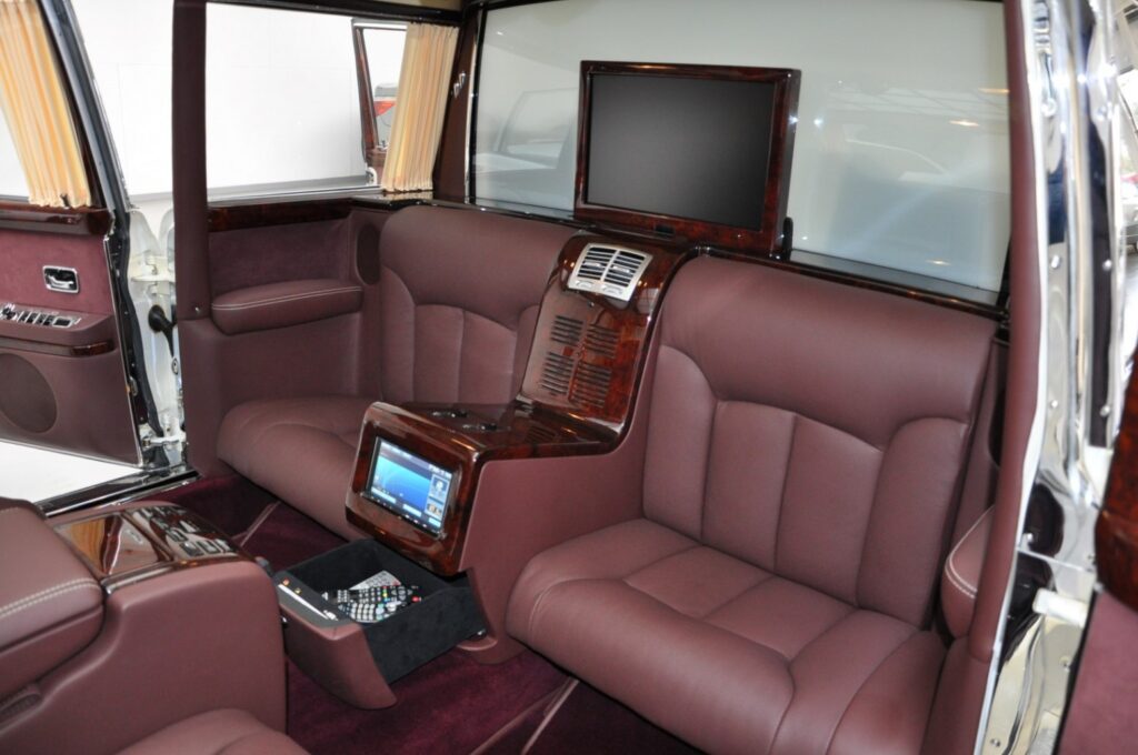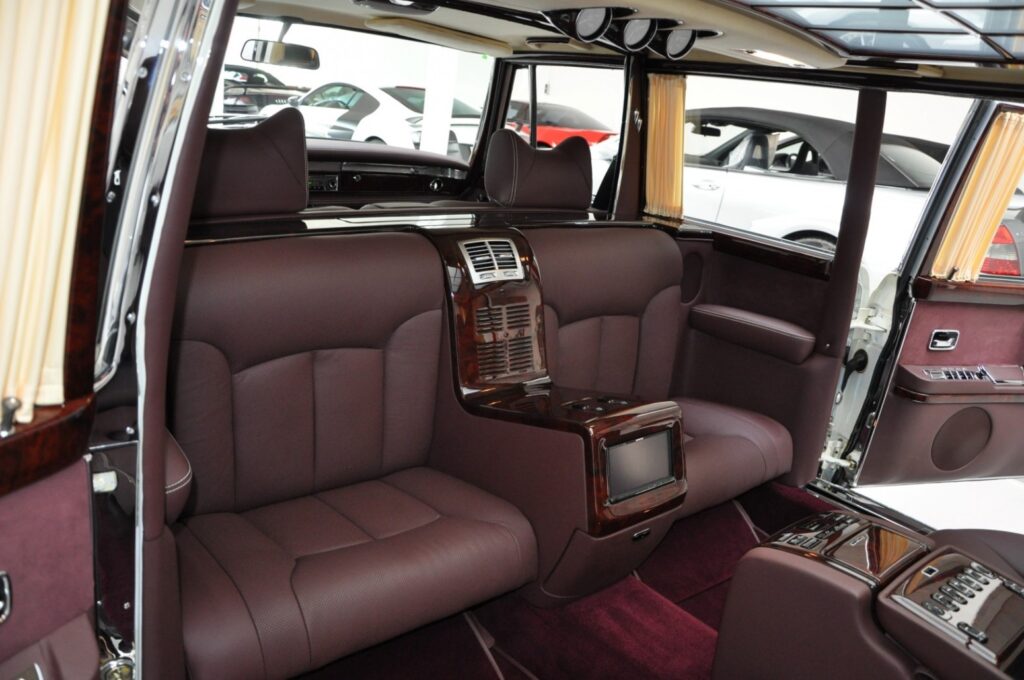 Trapa panoramică, plafonul iluminat, ceasurile de bord, tapițeria din piele, scaunele reglabile electric, cu ventilare și încălzire, lumini ambientale, DVD, sistem audio, tot ce vrei și ce se putea, a fost înghesuit în limuzina anilor 80.