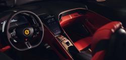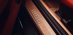 Interiorul mașinii aduce un alt nivel de personalizare, folosind materiale sustenabile. Scaunele sunt îmbrăcate în piele Nappa sintetică, iar cusăturile sunt realizate din fire obținute din reciclarea anvelopelor. Detalii din lemn se regăsesc pe praguri, cu inscripții aurii ce poartă semnătura Ferrari, iar podeaua din spate, precum și covoarele, au o textură unică, realizată tot din lemn.