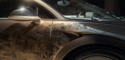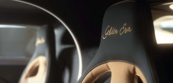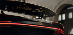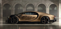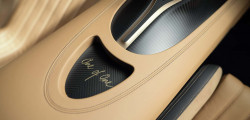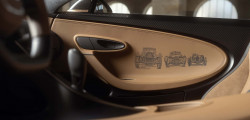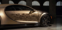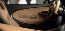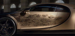 Partea frontală a mașinii este finisată în nuanța Negru Nocturne, ulterior se face tranziția către a doua culoare, creată special pentru acest exemplar unicat, Auriu Dore. Ce ține de schițe, pe partea stângă este istoria mărcii franceze începând cu anul 1987, fiind incluse modele ca EB110, Veyron și Chiron.