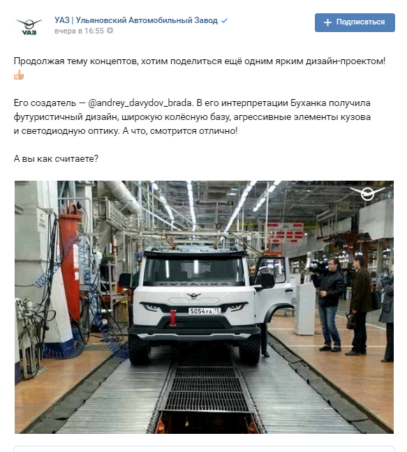 Producătorul din Ulianovsk a prezentat pe rețelele sociale un nou concept, care ar putea deveni eventual succesorul binecunoscutului UAZ Buhanka. Din imagini se observă o linie de design cu note ce rezonează cu aspectul originalului, care este produs cu unele modificări, de peste 60 ani.