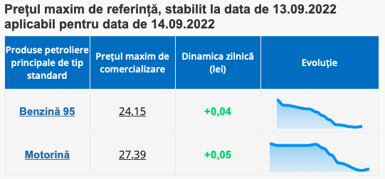 Mai exact, benzina se va scumpi cu 4 bani și va ajunge să coste cel mult 24.15 lei per litru, în timp ce motorina adaugă la preț 5 bani și se va comercializa nu mai scump de 27.39 eli per litru.