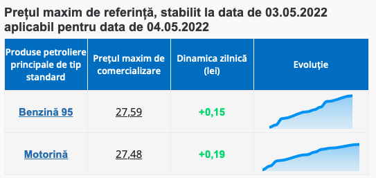 Astfel, pentru data de 4 mai, se anunță o scumpire a benzine cu 15 bani, care va ajunge să se comercializeze cu maxim 27.59 lei. Motorina la rândul ei, adaugă la cost 19 bani și se va vinde la pompă cu cel mult 27.48 lei.