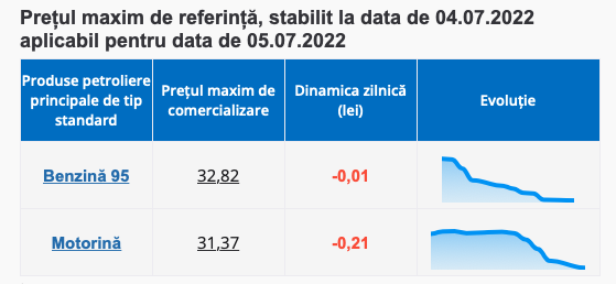 Așadar, potrivit informațiilor publicate de Agenție, mâine 5 iulie, benzina se va ieftini insesizabil cu doar 1 ban și va avea un preț maxim de 32.82 lei. În același timp, motorina scade din preț 21 de bani și se va comecializa nu mai scump de 31.37 lei!