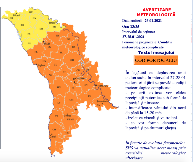 Serviciul Hidrometeorologic de Stat anunță că în legătură cu deplasarea unui ciclon sudic în intervalul 27-28.01 pe teritoriul țării se prevăd condiții meteorologice complicate:
