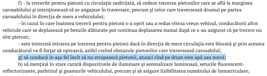 Dacă ar fi să cercetăm bine Regulamentul Circulației Rutiere, aflăm că șoferul este obligat să conducă cu grijă astfel ca să nu stropească pietonii! Acest lucru este menționat în Capitolul II ”DREPTURILE, OBLIGAŢIILE ŞI RESTRICŢIILE PENTRU CONDUCĂTORII DE VEHICULE”, punctul 11(f).