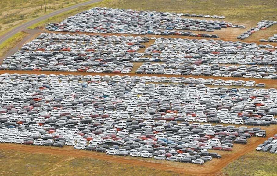 Iar soluția, singura soluție de fapt, arată ca un cimitir de mașini abandonate. Pe o suprafață de zeci de kilometri, separate în porțiuni mai mari sau mai mici, au fost parcate una lângă alta, la distanță de câțiva centimetri, toate mașinile care nu pot fi puse în circulație.
