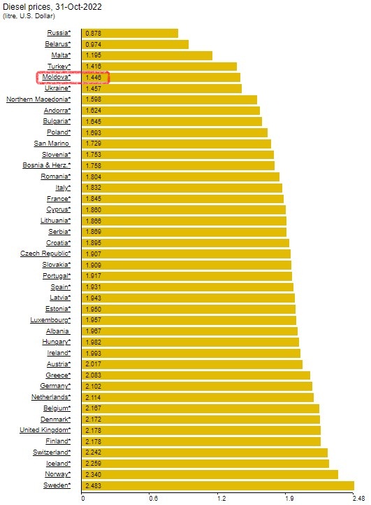 Prețuri mai joase decât în Republica Moldova pot fi găsite doar în Federația Rusă, Belarus și Turcia, țări care dispun de capacități proprii semnificative de producere și care reprezintă jucători importanți în lanțul logistic regional de utilizare a petrolului rusesc.