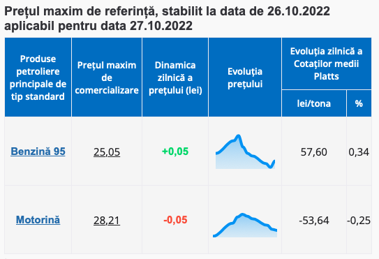 ANRE a publicat câteva clipe în urmă prețurile plafon ale principalelor tipuri de carburanți, valabil pentru ziua de mâine,27 octombrie.