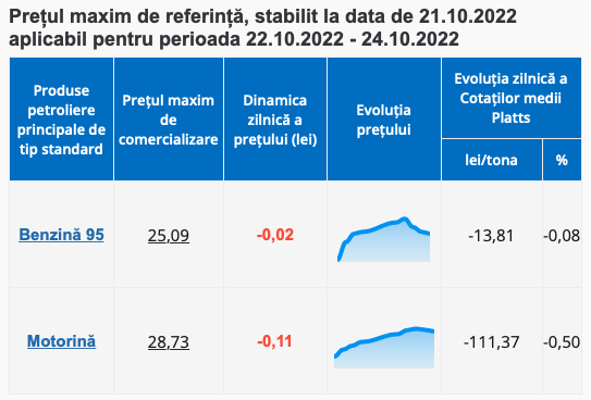Așadar, începând cu miezul nopții, benzina se va ieftini cu 2 bani și va avea un preț maxim de comercializare de 25.09 lei per litru, în timp ce motorina va scădea din preț 11 bani și se va vinde la pompă cu cel mult 28.73 lei per litru.