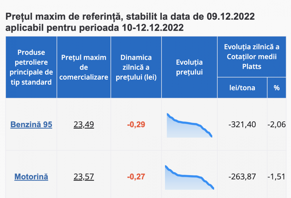 Începând cu ziua de mâine, un litru de benzină se va comercializa cu 23.49 lei, după o scădere cu 29 de bani. Iar prețul motorinei nu va depăși 23.57 lei, înregistrând o scădere cu 27 de bani.