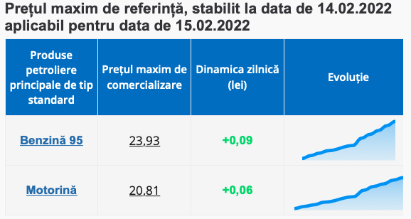 Așadar, pentru mâine 15 februarie, Agenția indică o majorare de preț a benzinei cu 9 bani, care ajunge să coste la stațiile PECO 23.93 lei. În același timp, motorina se scumpește cu 6 bani și se va comercializa cu maxim 20.81 lei.