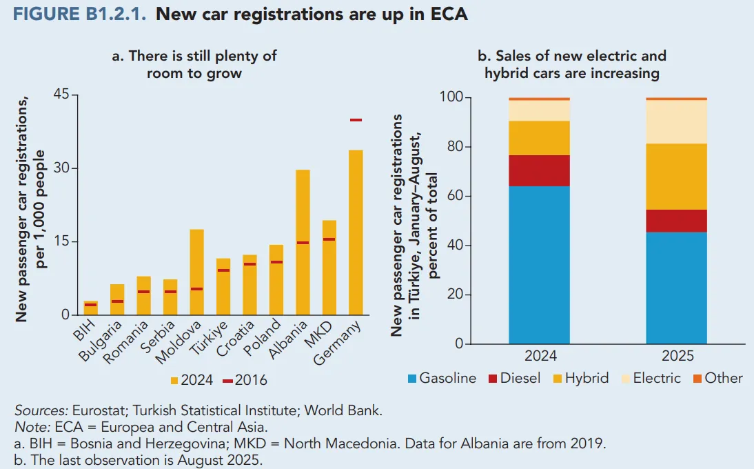 Un nou raport al Băncii Mondiale, intitulat „Locuri de muncă și prosperitate – Actualizarea economică pentru Europa și Asia Centrală, ediția de toamnă 2025”, arată că numărul înmatriculărilor de autoturisme noi a crescut semnificativ în ultimii ani în Europa și Asia Centrală. Expansiunea este alimentată de cererea solidă a consumatorilor și de rata scăzută de deținere a automobilelor în multe țări din regiune.