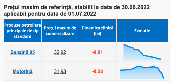 Așadar, mâine, 1 iulie, benzina va deveni mai ieftină cu doar 1 ban și se va vinde cu maxim 32.92. În același timp, motorina scade din preț 28 de bani și ajunge să coste la pompă cel mult 31.93 lei!
