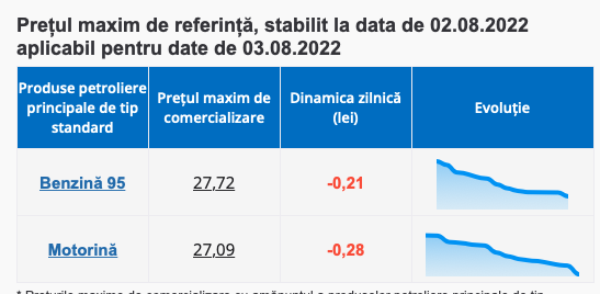 Pentru mâine, 3 august, Agenția anunță o ieftinire a benzinei cu 21 de bani, care ajunge să coste nu mai mult de 27.72 lei, în timp ce motorina scade din cost 28 de bani și se va comercializa nu mai scump de 27.09 lei!