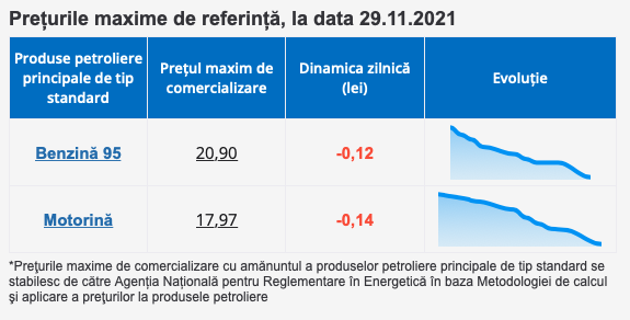 În această ordine de idei, de la începutul lunii noiembrie, benzina s-a ieftinit cu 95 de bani, iar motorina cu 49 de bani.