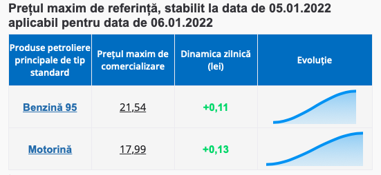 Pentru ziua de mâine, 6 ianuarie, Agenția anunță o scumpire a benzinei standard cu 11 bani, astfel că prețul la pompă va fi de 21.54 lei, în timp ce motorina se scumpește cu 13 bani și ajunge să se comercializeze cu 17.99 lei, tot mai aproape de a trece de un nou prag psihologic.