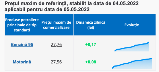 Astfel, Agenția anunță că benzina mâine va costa cu 17 bani mai scump, dar nu mai mult de 27.76, în timp ce motorina adaugă la cost 8 bani și se va comercializa cu maxim 27.56 lei.