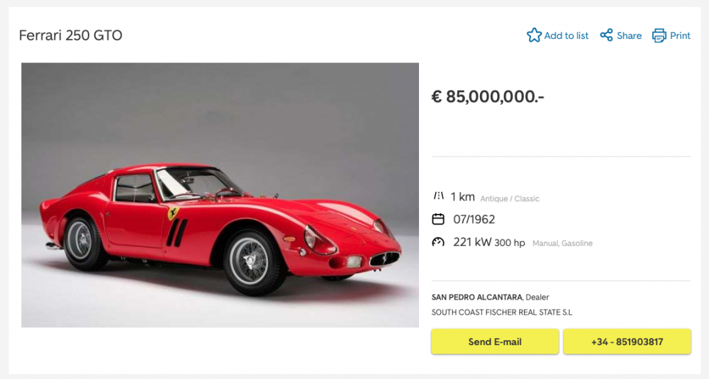 Pe site-ul de vânzări online Autoscout24.com, a fost recent socs la vânzare cel mai scump automobil vândut vreodată. Potrivit descrierii anunțului, este vorba anume despre acel celebru Ferari 250 GTO din 1962, licitat în 2018 cu 48.4 milioane de dolari!