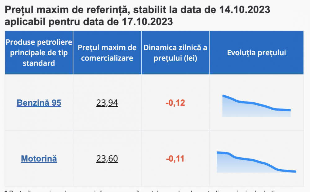 Ieftinirile la combustibili au devenit o rutină plăcută, după o perioadă de timp, asistăm la o nouă scădere a prețurilor. Pentru ziua de mâine, 17 octombrie, ANRE a afișat noile prețuri plafon.
