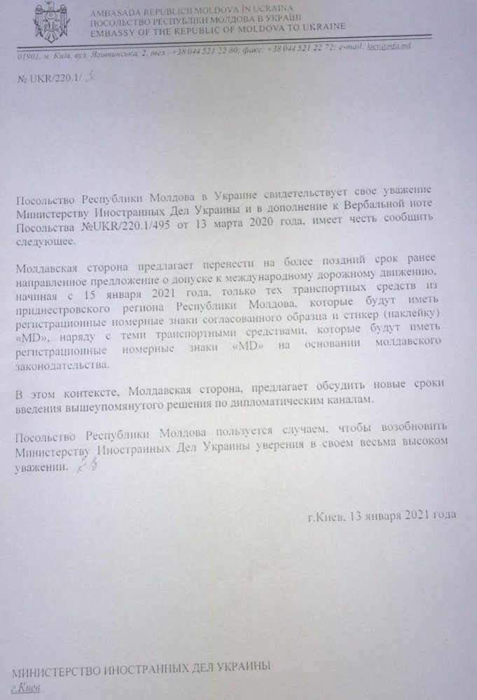 Deputatul „Platformei DA”, Igor Munteanu, a publicat o cerere a Ambasadei Republicii Moldova din Ucraina expediată Ministerului Afacerilor Externe de la Kiev, cu solicitarea de a amâna restricțiile de circulație pentru vehiculele cu numere de înregistrare de tip transnistrean ce urmau să fie aplicate începând cu 15 ianuarie, scrie deschide.md