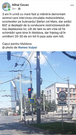 Însă ieri, 10 iulie, indicatorul 3.5.2. a reapărut în același loc, astfel autoritățile au restricționat circulația ciclomotoarelor fără măcar a anunța acest lucru și a explica de ce a fost luată această decizie.
