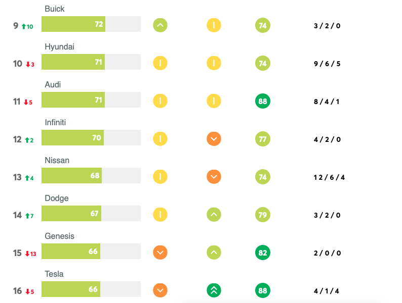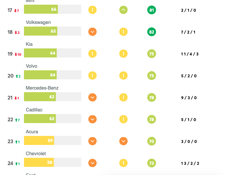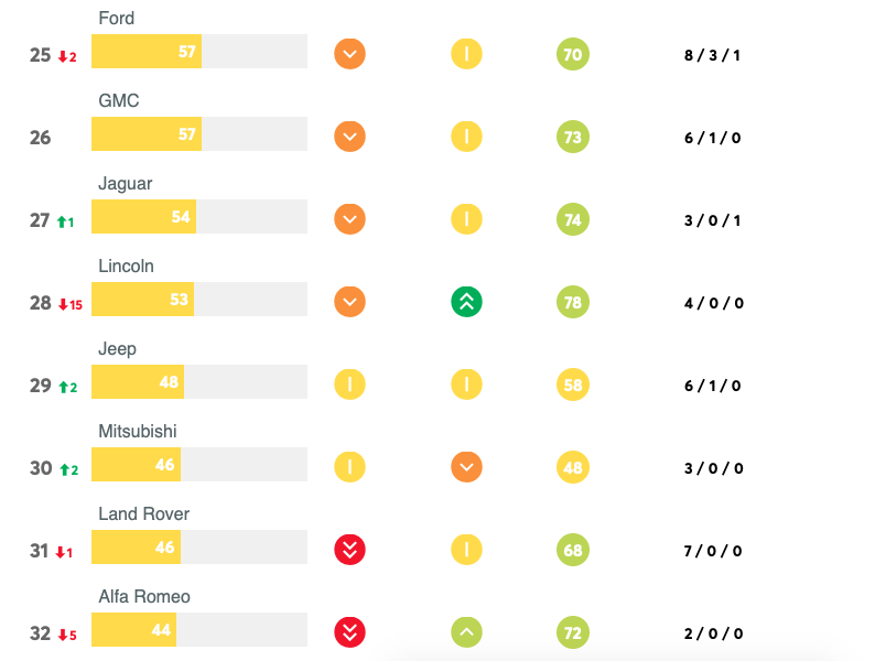 Kia, Genesis și Lincoln au căzut dramatic cu 10,13 și respectiv 15 poziții, iar ultimele locuri din clasament sunt ocupate de Land Rover și Alfa Romeo, a căror fiabilitate, din punctul de vedere al consumatorilor, lasă mult de dorit.