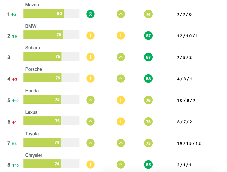 Consumer Reports a pregătit un nou rating al mărcilor auto. De data aceasta specialiștii au pregătit un clasament al brandurilor pe care șoferii le-au numit cele mai bune. Locurile au fost repartizate în funcție de: manevrabilitatea, fiabilitatea, satisfacția proprietarilor și siguranța pe care o oferă mașinile. Pe primul loc a urcat Mazda, ridicându-se cu trei poziții față de clasamentul anterior, grație fiabilității și satisfacției care a reușit să o trezească în rândurile proprietarilor modelelor sale.